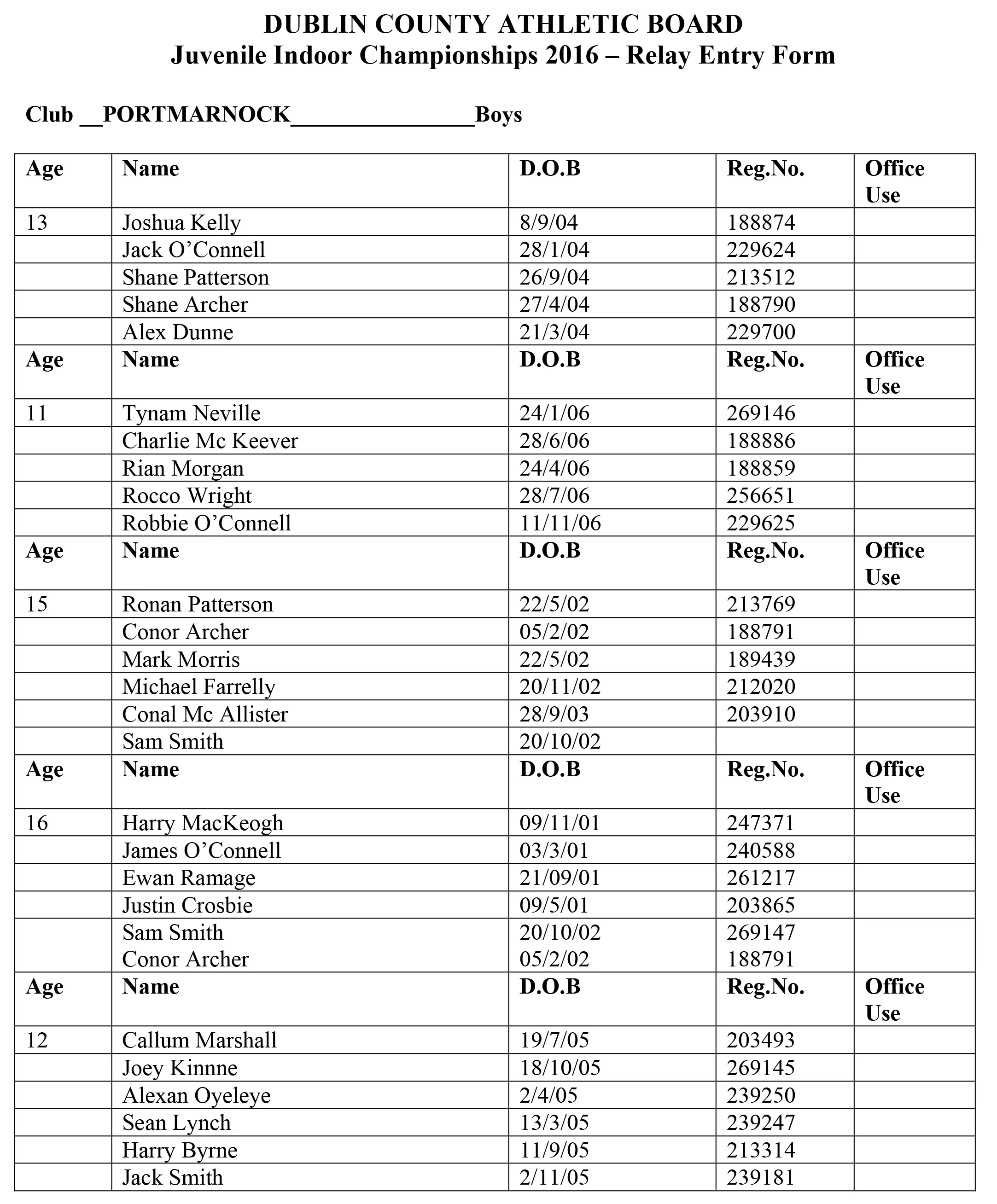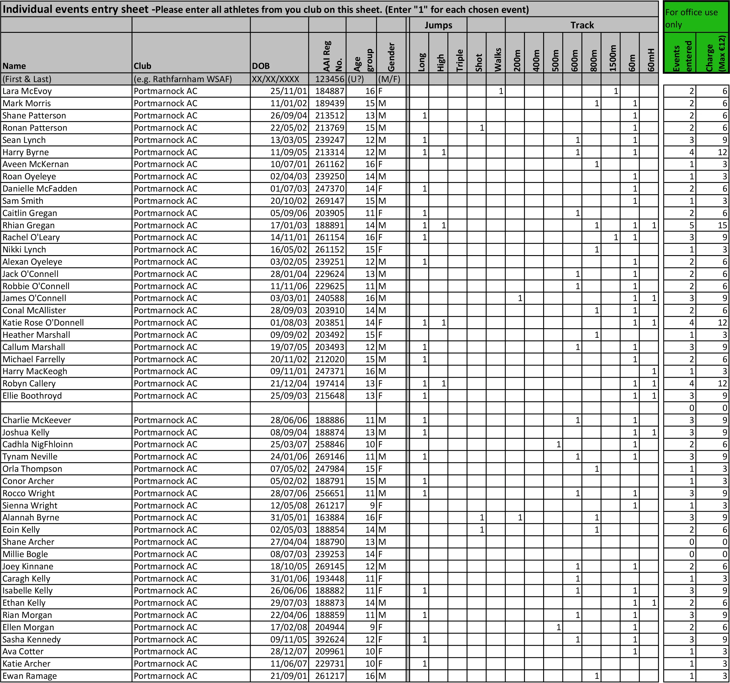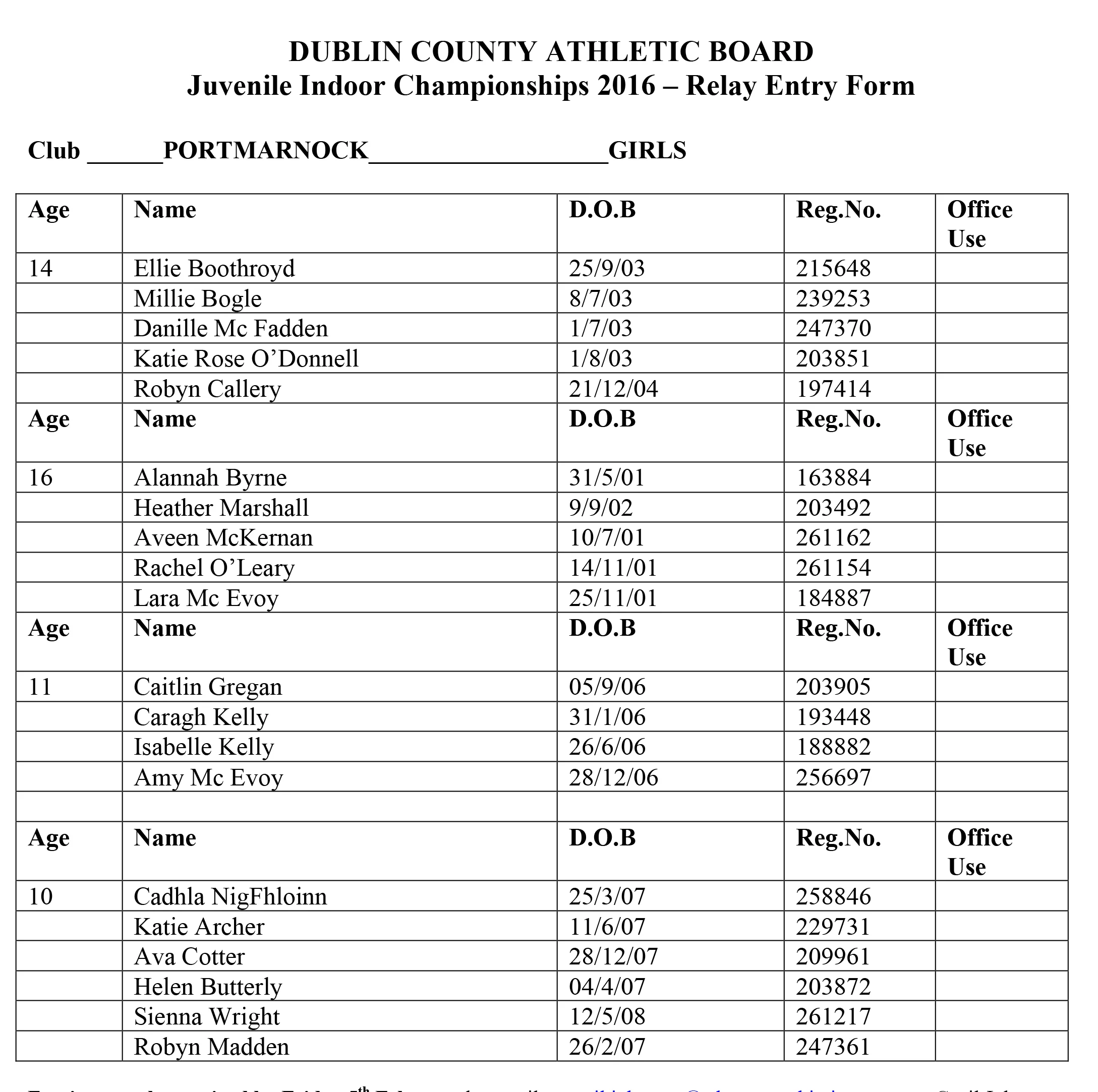 Below is listed the individual entries for the Dublin Indoor Juvenile Championships - please check your event and date which it's on.