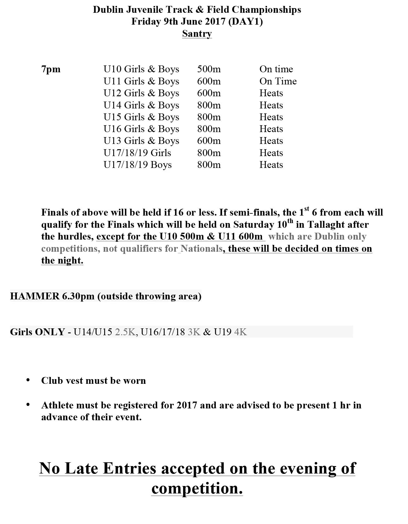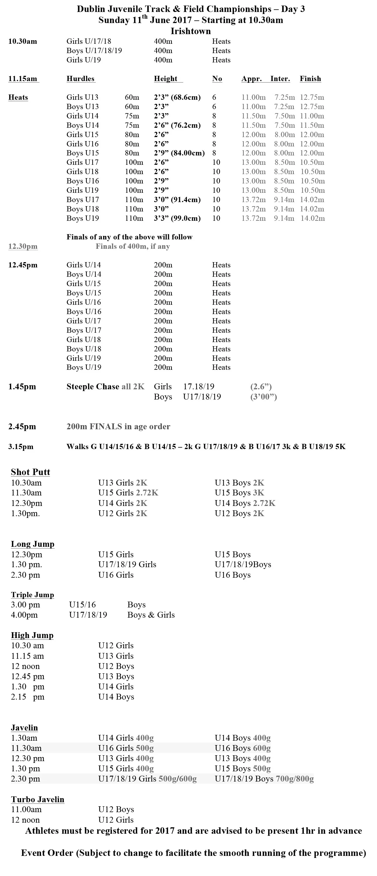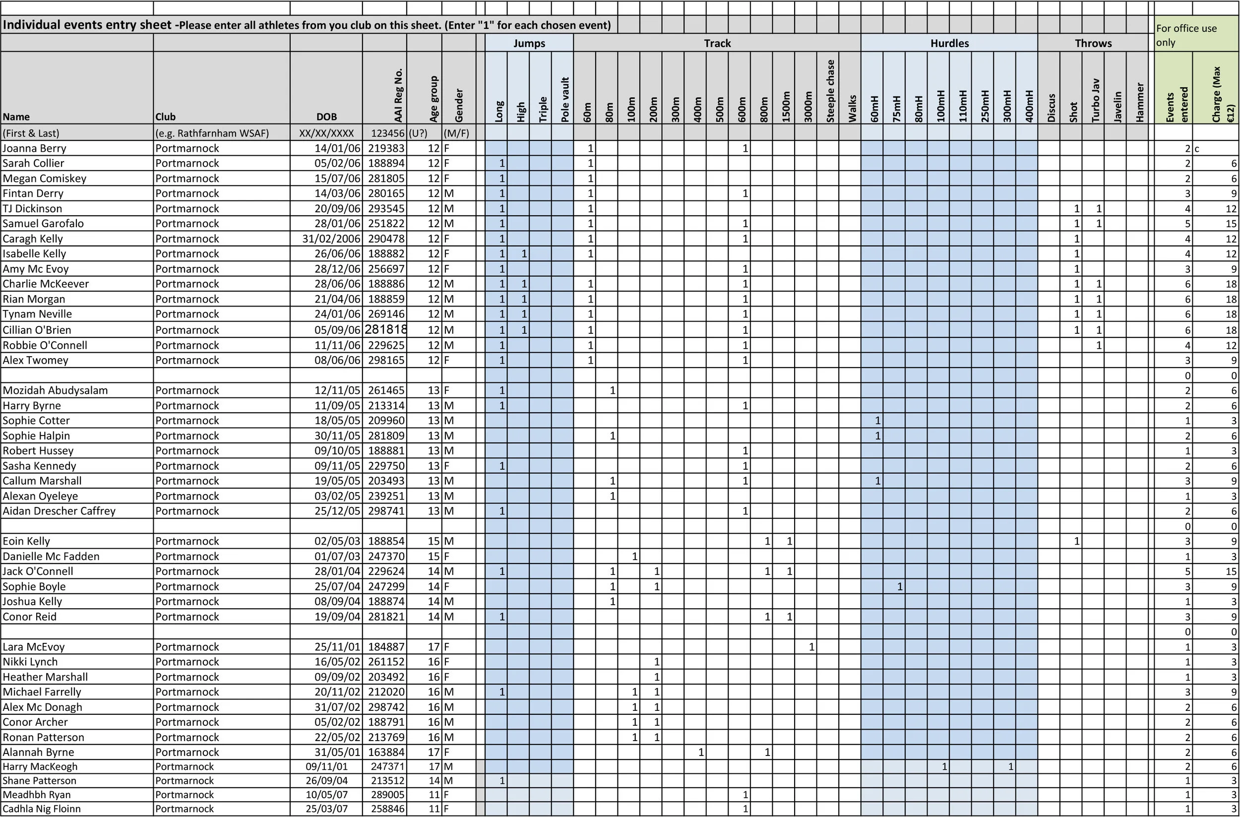Portmarnock AC entries for the Dublin Championships 2017 listed below. Please check that all is correct.