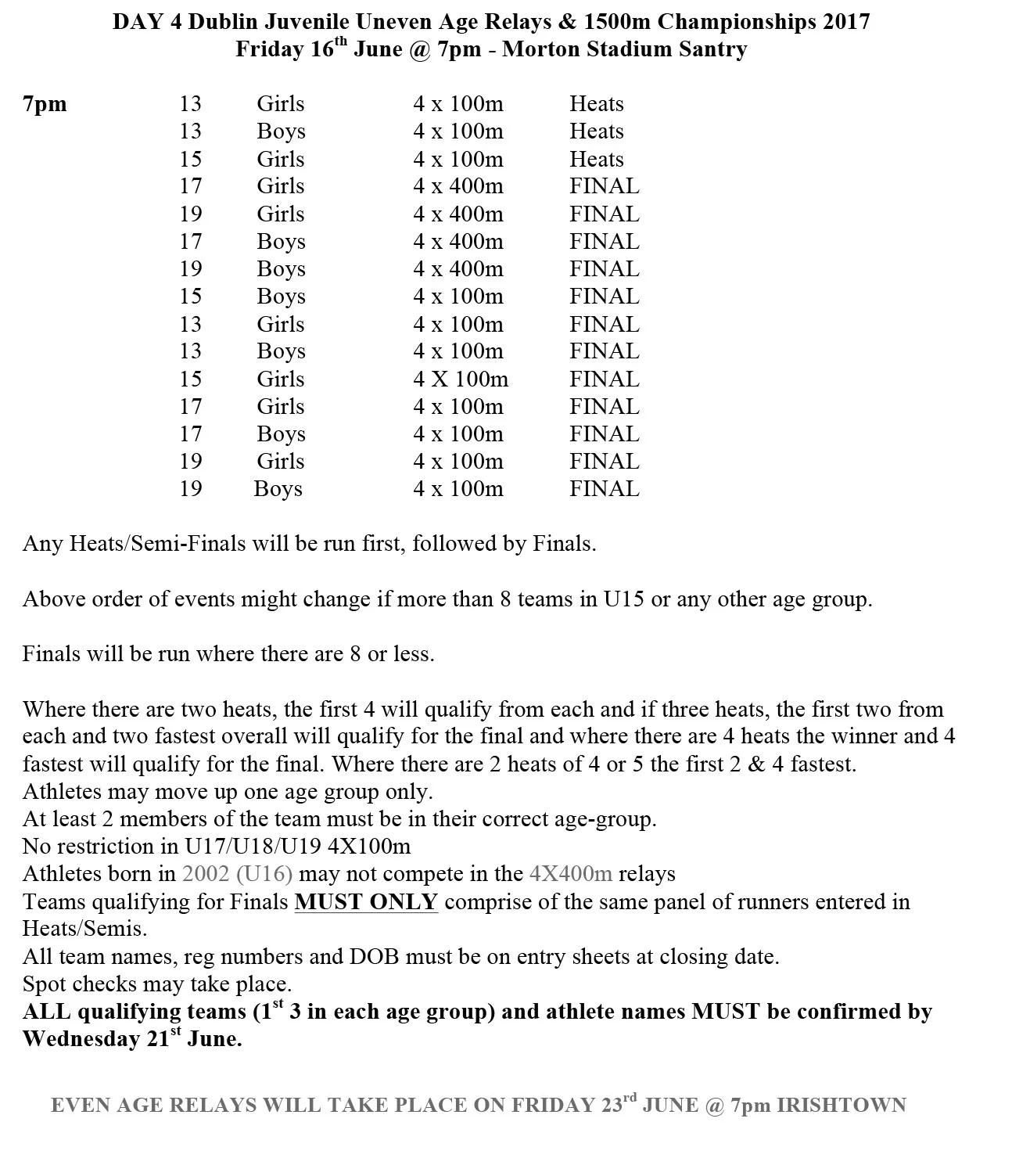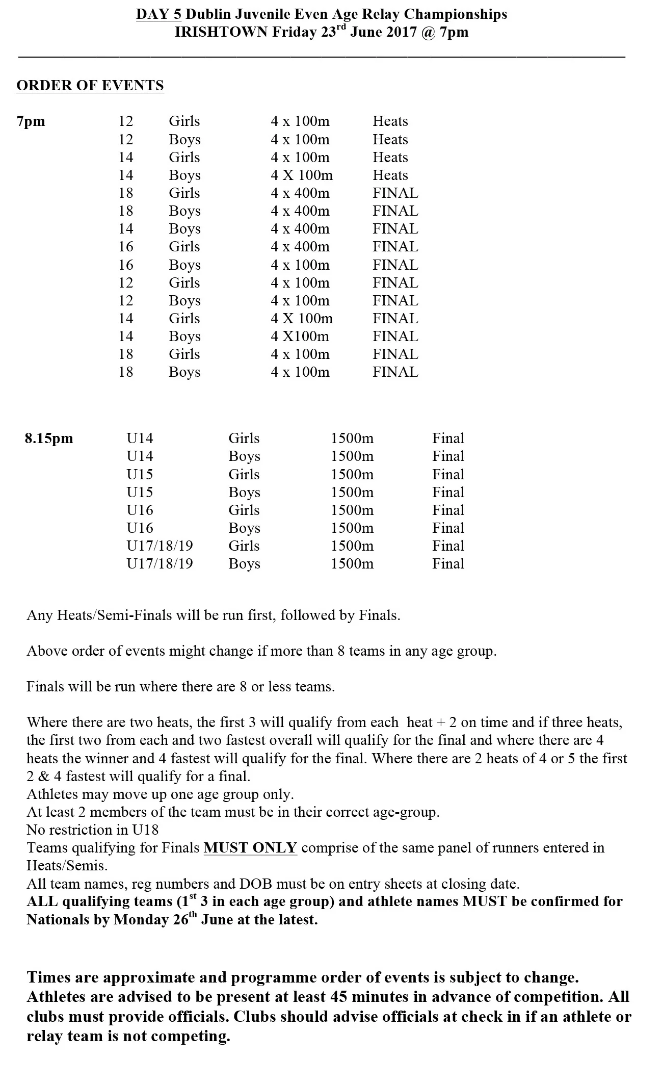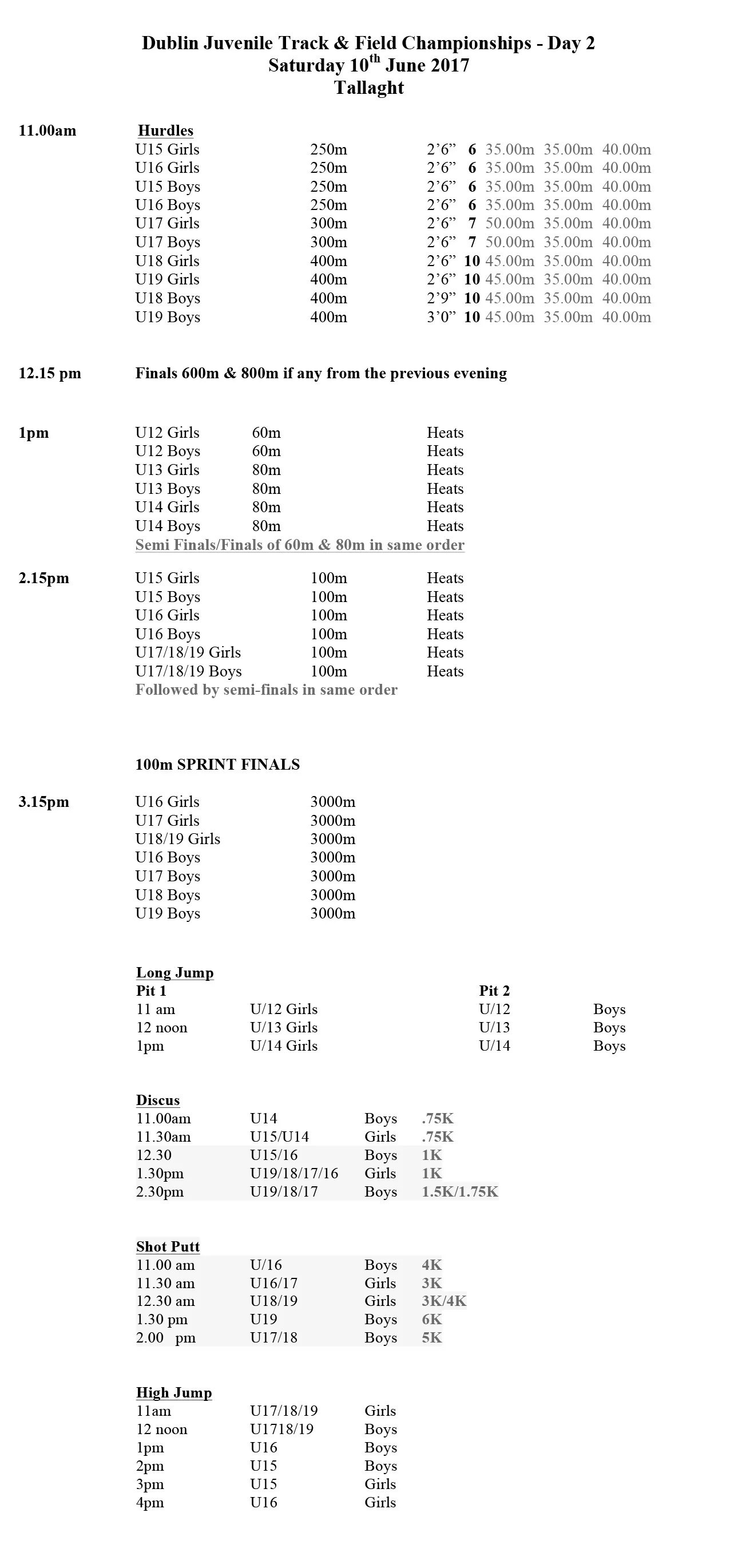 Portmarnock AC entries for the Dublin Championships 2017 listed below. Please check that all is correct.