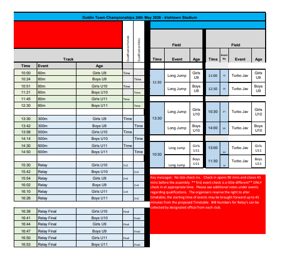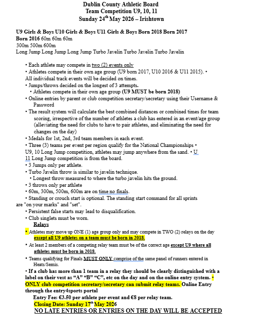 The Dublin Children’s Games are a key juvenile athletics competition in Dublin, organised by Dublin Athletics. They’re designed specifically for younger athletes (U9, U10, and U11) as an introduction to structured competition.